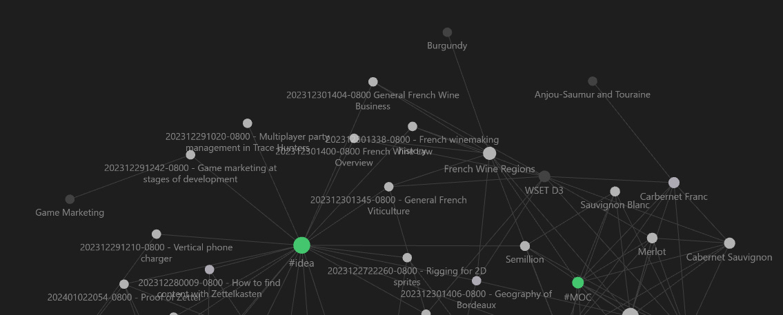 The Map of Content is where I summarize more about the atomic knowledge units I just summarized. It helps me map out where and what they are, as well as gives me a place to write longer form information for at-a-glance studying. It still isn’t great, admittedly. As you can see, even in this trimmed view the graph is kind of a mess. Hopefully as I push into this more it evolves. Evolution of knowledge graphs is kind of a backing theory of Zettelkasten anyway.